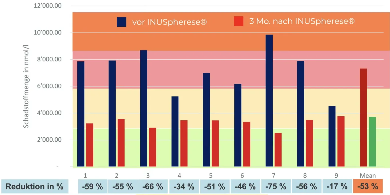 Zur Reduktion bestimmter Umweltgifte setzt die Alpstein Clinic auf die INUSpherese®, ein modernes Aphereseverfahren. Dabei wird das Blutplasma ausserhalb des Körpers gefiltert, um gezielt belastende Substanzen zu entfernen. Im Unterschied zu rein unterstützenden Entgiftungsmassnahmen werden die Schadstoffe nicht nur mobilisiert, sondern effektiv aus dem Blut entfernt.